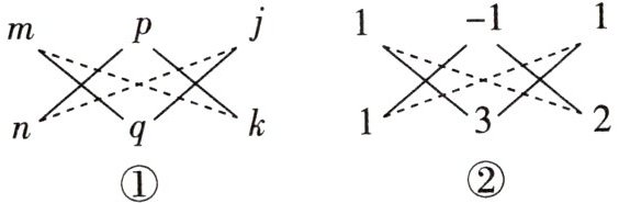 2. 改编题 对于形如$ax^{2}+bxy+cy^{2}+dx+ey+f$的关于x,y的二元二次多项式可以用“双十字相乘法”来分解,如图①,将a分解成m,n的乘积作为第1列,c分解成p,q的乘积作为第2列,f分解成j,k的乘积作为第3列,如果$mq+np=b,pk+qj=e,mk+nj=d$,即第1,2列、第2,3列和第1,3列都满足十字相乘规则,则原式$=(mx+py+j)(nx+qy+k).$
