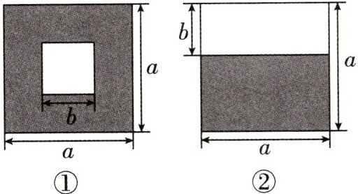 $1 < m < 2$ 解析: 题图①的阴影部分的面积为 $a^2 - b^2$, 题图②的阴影部分的面积为 $a^2 - ab$, $\therefore m = \frac{a^2 - b^2}{a^2 - ab} = \frac{(a - b)(a + b)}{a(a - b)} = \frac{a + b}{a} = 1 + \frac{b}{a}$. $\because a > b > 0$, $\therefore 1 < m < 2$.