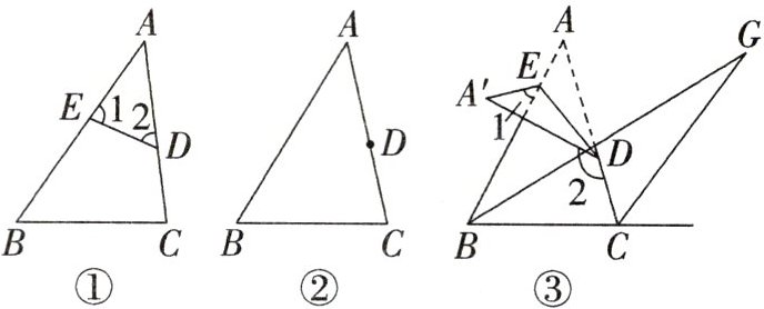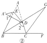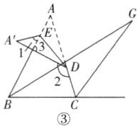 (2)把$△ABC$沿着DE所在的直线折叠,使A的对应点$A'$落在$△ABC$的外部,如图③,$∠ABC$的平分线和与$∠ACB$相邻的外角的平分线相交于点G.