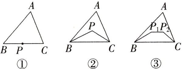 (2)知,BM+CM<AB+AC,又P₁P₂<P₁M+P₂M,可得BP₁+P₁P₂+P₂C<BM+CM<AB+AC,可得结论.或作直线P₁P₂分别交AB,AC于点M,N(如图③),在△BMP₁中,BP₁<BM+MP₁,在△AMN中,MP₁+P₁P₂+P₂N<AM+AN,在△P₂NC中,P₂C<P₂N+NC,三式相加得BP₁+P₁P₂+P₂C<AB+AC,可得结论.