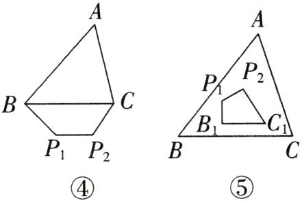 (5)四边形B₁P₁P₂C₁的周长<△ABC的周长.理由如下:如图④,分别作如图所示的延长线交△ABC的边于点M,N,K,H,在△BNM中,NB₁+B₁P₁+P₁M<BM+BN,又B₁C₁+C₁K<NB₁+NC+CK,C₁P₂+P₂H<C₁K+AK+AH,P₁P₂<P₂H+MH+P₁M,将以上各式相加,得B₁P₁+P₁P₂+P₂C₁+B₁C₁<AB+BC+AC,即可得结论.