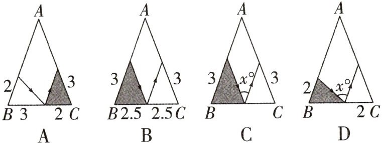 6. 如图,有一张三角形纸片ABC,已知$∠B=$$∠C=x^{\circ }$,按下列方案用剪刀沿着箭头方向剪开,可能得不到全等三角形纸片的是 ( )