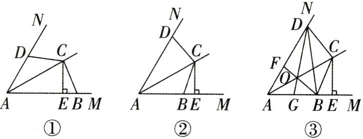 (3)如图③,在(2)的条件下,若$∠MAN=60^{\circ }$,连接BD,作$∠ABD$的平分线BF交AD于点F,交AC于点O,连接DO并延长交AB于点G.若$BG=1,DF=2$,求线段DB的长.