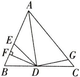 5.5 解析:如图,作$DM = DE$交$AC$于点$M$,过点$D$作$DN\perp AC$于点$N$。$\because DE = DG$,$\therefore DM = DG$。在$Rt\triangle DNM$和$Rt\triangle DNG$中,$DM = DG$,$DN = DN$,$\therefore Rt\triangle DNM\cong Rt\triangle DNG(HL)$。$\because AD$是$\triangle ABC$的角平分线,$DF\perp AB$,$\therefore$在$\triangle AFD$和$\triangle AND$中,$\begin{cases}\angle AFD = \angle AND\\\angle DAF = \angle DAN\\AD = AD\end{cases}$,$\therefore \triangle AFD\cong \triangle AND(AAS)$,$\therefore DF = DN$。