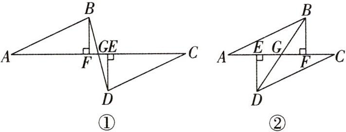 (1) $EG = FG$. 解析: $ \because DE \perp AC, BF \perp AC, \therefore \angle BFA = \angle DEC = 90^\circ $. $ \because AE = CF, \therefore AE - EF = CF - EF $, 即 $ AF = CE $. 在 $ Rt \triangle ABF $ 和 $ Rt \triangle CDE $ 中, $ \left\{ \begin{array} { l } { AB = CD }, \\ { AF = CE }, \end{array} \right. $ $ \therefore Rt \triangle ABF \cong Rt \triangle CDE ( HL ) $, $ \therefore BF = DE $, 在 $ \triangle BFG $ 和 $ \triangle DEG $ 中, $ \left\{ \begin{array} { l } { \angle BFG = \angle DEG = 90 ^ { \circ } }, \\ { \angle BGF = \angle DGE }, \\ { BF = DE }, \end{array} \right. $ $ \therefore \triangle BFG \cong \triangle DEG ( AAS ), \therefore EG = FG $.