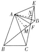 (2) 如图, 作 $ AM \perp BD $ 于点 $ M $, 作 $ AN \perp CE $ 于点 $ N $. 由 $ \triangle BAD \cong \triangle CAE $ 得, $ BD = CE, S _ { \triangle BAD } = S _ { \triangle CAE } $. $ \therefore \frac { 1 } { 2 } \cdot BD \cdot AM = \frac { 1 } { 2 } \cdot CE \cdot AN, \therefore AM = AN $,