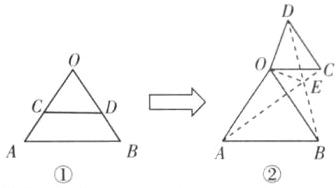 如图①, $ \triangle OAB $ 和 $ \triangle OCD $ 为等腰三角形, $ OA = OB, OC = OD $, 将 $ \triangle OCD $ 绕点 $ O $ 旋转一定角度, 连接 $ AC, BD $, 相交于点 $ E $, 连接 $ OE $, 如图②, 则可得结论: ① $ AC = BD $; ② $ EO $ 平分 $ \angle AED $; ③ $ AC, BD $ 所在直线的夹角与 $ \angle AOB $ 相等或互补.