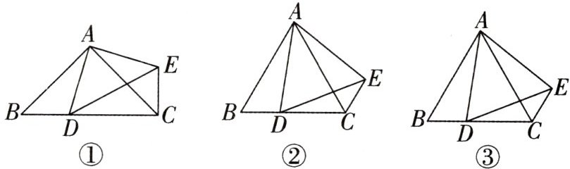 (3)如图③,设$∠BAC=α,∠BCE=β$,当点D在线段BC上移动时,α,β的数量关系是什么?请说明理由.