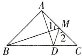 4. 如图,在$\triangle ABC$中,$\angle BAC = 90^{\circ}$,$AB = AC$,$M$是$AC$的中点,$AD \perp BM$交$BC$于点$D$,连接$DM$,求证:$\angle 1 = \angle 2$.