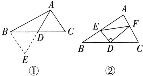 如图②,在$\triangle ABC$中,$D$是$BC$边上的中点,$DE \perp DF$于点$D$,$DE$交$AB$于点$E$,$DF$交$AC$于点$F$,连接$EF$,求证:$BE + CF > EF$.