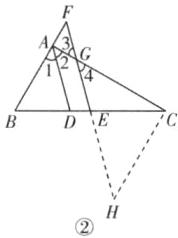 (2) 如图②所示,延长 $FE$ 到 $H$ 使 $FE = EH$,连接 $CH$。在 $\triangle BFE$ 和 $\triangle CHE$ 中,$\begin{cases}EF = EH,\\\angle FEB = \angle HEC,\\BE = CE,\end{cases}$ $\therefore \triangle BFE \cong \triangle CHE(SAS)$。$\therefore \angle H = \angle F$,$BF = CH$。又 $\because \angle F = \angle 3 = \angle 4$,$\therefore \angle H = \angle 4$,$\therefore HC = CG$,$\therefore BF = CG$。