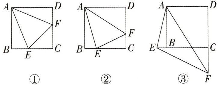 (2) 将 $\triangle ADF$ 绕着点 $A$ 按顺时针方向旋转 $90^{\circ}$,得 $\triangle ABF'$,如图②,则 $\angle ABF' = \angle D$,$AF = AF'$,$\angle BAF' = \angle DAF$。$\because$ 四边形 $ABCD$ 是正方形,$\therefore \angle D = \angle ABC = 90^{\circ}$,$\therefore \angle ABF' = 90^{\circ}$,$\therefore \angle F'BC = 180^{\circ}$,$\therefore$ 点 $F'$,$B$,$E$ 在一条直线上。$\because \angle EAF = 45^{\circ}$,$\therefore \angle DAF + \angle BAE = 45^{\circ} = \angle F'AB + \angle BAE = \angle F'AE = \angle EAF$。又 $\because AE = AE$,$\therefore \triangle AF'E \cong \triangle AFE(SAS)$,$\therefore EF = EF'$,$\therefore EF = F'E = BE + DF$。