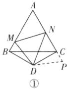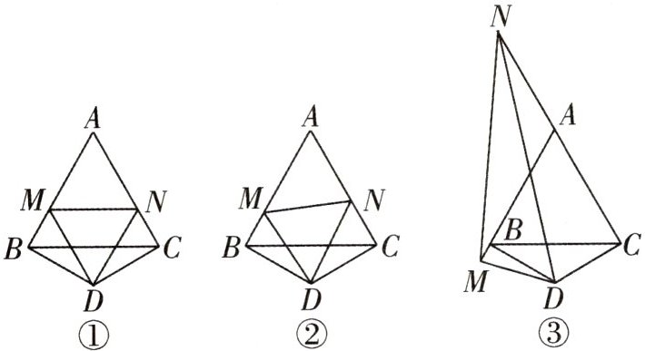 (1) 问的两个结论仍然成立。证明:如图①,在 $AC$ 的延长线上截取 $CP = BM$,连接 $DP$,在等边 $\triangle ABC$ 中,$\angle ABC = \angle ACB = 60^{\circ}$。$\because \angle BDC = 120^{\circ}$,$BD = DC$,$\therefore \angle DBC = \angle DCB = 30^{\circ}$,