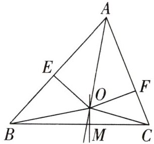 证明:如图,作$ ∠BAC $的平分线与边BC的垂直平分线OM交于点O,则$ OB = OC $,再作OE垂直AB于点E,OF垂直AC于点F,则$ OE = OF $,$ ∴ Rt△BOE ≌ Rt△COF $,$ ∴ BE = CF $. ①