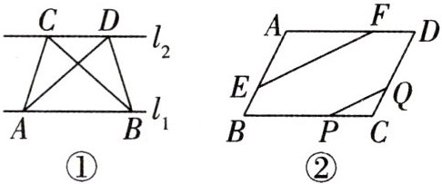 如图②,已知AB//CD,AD//CB,P,Q分别是线段BC,CD上的点,$$ C P = \frac { 1 } { 3 } B C $$,$$ C Q = \frac { 1 } { 3 } C D $$,E,F分别是线段AB,AD上的点,$$ A E = \frac { 2 } { 3 } A B $$,$$ A F = \frac { 2 } { 3 } A D $$,连接PQ,EF,若△PCQ的面积是4。