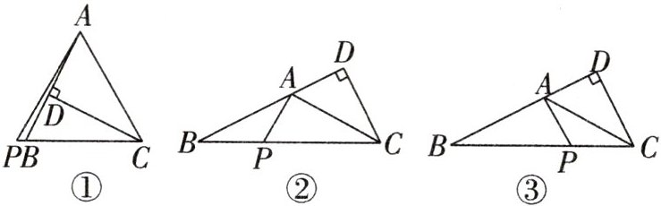 (2) 当点 $ P $ 在边 $ BC $ 上,且 $\angle APC = 60^{\circ}$ 时,$ PC - PB = PA $;当点 $ P $ 在边 $ BC $ 上,且 $\angle APC = 120^{\circ}$ 时,$ PB - PC = PA $。 解析: 当点 $ P $ 在边 $ BC $ 上,且 $\angle APC = 60^{\circ}$ 时,如图②,过点 $ A $ 作 $ AH \perp BC $,垂足为 $ H $。$\because CD $ 是 $\triangle ABC $ 的高,$\therefore \angle AHB = \angle AHC = \angle BDC = 90^{\circ}$,$\therefore \angle BAH + \angle ABC = 90^{\circ}$,$\angle BCD + \angle ABC = 90^{\circ}$。$\therefore \angle BAH = \angle BCD$。$\because \angle BAC = 2 \angle BCD$,$\therefore \angle BAC = 2 \angle BAH$。$\therefore \angle BAH = \angle CAH$。在 $\triangle ABH$ 和 $\triangle ACH$ 中,$\begin{cases} \angle AHB = \angle AHC, \\ AH = AH, \\ \angle BAH = \angle CAH, \end{cases}$ $\therefore \triangle ABH \cong \triangle ACH$,$\therefore BH = CH$,$\because \angle APC = 60^{\circ}$,$\therefore \angle PAH = 90^{\circ} - 60^{\circ} = 30^{\circ}$,$\therefore PA = 2PH$。$\because PB = BH - PH$,$ PC = PH + HC $,$\therefore PC - PB = PH + HC - BH + PH = 2PH = PA $,即 $ PC - PB = PA $。当点 $ P $ 在边 $ BC $ 上,且 $\angle APC = 120^{\circ}$ 时,如图③,过点 $ A $ 作 $ AH \perp BC $,垂足为 $ H $。$\because CD $ 是 $\triangle ABC $ 的高,$\therefore \angle AHB = \angle AHC = \angle BDC = 90^{\circ}$,$\therefore \angle BAH + \angle ABC = 90^{\circ}$,$\angle BCD + \angle ABC = 90^{\circ}$,$\therefore \angle BAH = \angle BCD$。$\because \angle BAC = 2 \angle BCD$,$\therefore \angle BAC = 2 \angle BAH$,$\therefore \angle BAH = \angle CAH$。在 $\triangle ABH$ 和 $\triangle ACH$ 中,$\begin{cases} \angle AHB = \angle AHC, \\ AH = AH, \\ \angle BAH = \angle CAH, \end{cases}$ $\therefore \triangle ABH \cong \triangle ACH$,$\therefore BH = CH$。$\because \angle APC = 120^{\circ}$,$\therefore \angle APB = 60^{\circ}$,$\therefore \angle HAP = 30^{\circ}$,$\therefore PA = 2PH$。$\because PB = BH + PH$,$ PC = HC - PH $,$\therefore PB - PC = BH + PH - HC + PH = 2PH = PA $,即 $ PB - PC = PA $。