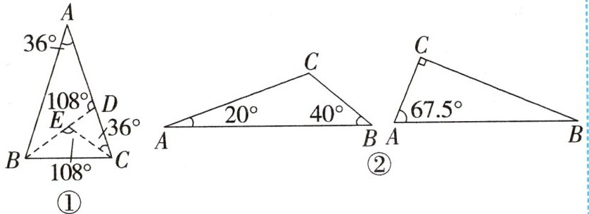 1. (2025·南充期末)定义:如果 1 条线段将一个三角形分割成 2 个等腰三角形,我们把这条线段叫作这个三角形的“双等腰线”.如果 2 条线段将一个三角形分割成 3 个等腰三角形,我们把这 2 条线段叫作这个三角形的“三等腰线”.如图①,线段 BD 将顶角为 $ 36^{\circ} $ 的等腰三角形 ABC 分成了两个等腰三角形,则线段 BD 是 $ \triangle ABC $ 的“双等腰线”;线段 BD,CE 将顶角为 $ 36^{\circ} $ 的等腰三角形 ABC 分成了三个等腰三角形,则线段 BD,CE 是 $ \triangle ABC $ 的“三等腰线”.