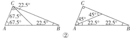 (1)请在图②中,作出 $ \triangle ABC $ 的“双等腰线”,并标出分成的等腰三角形的底角的度数: