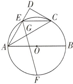 10. 如图,AB为$\odot O$的直径,且$AB = 10$,C为$\odot O$上一点,AC平分$∠DAB$,DA交$\odot O$于点E,$AE = 6$,$AD⊥CD$于点D,F为半圆弧$\overset{\frown}{AB}$的中点,EF交AC于点G。