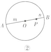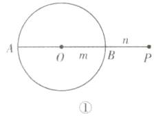 点圆最值问题:平面内一点P,到$\odot O$上的点的最大距离为PA,最小距离为PB;设最大距离为m,最小距离为n,点P在圆外时(如图①),圆的直径是$m - n$,点P在圆内时(如图②),圆的直径为$m + n$。