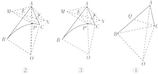 (3) $3\sqrt{21}-9$ 解析:如图②,设$\overset{\frown}{BC}$对应的圆心为O,连接AP,OP,分别以AB,AC所在直线为对称轴,作出P关于AB的对称点为M,P关于AC的对称点为N,连接MN,交AB于点E,交AC于点F,连接PE,PF,OB,OC,OA,AM,AN,MP,NP,