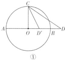 ∴$BD = 1$。当点D在$\odot O$外时(如图①中点D),$OD = 3$,$CD=\sqrt{13}$;当点D在$\odot O$内时(如图①中点$D'$),$OD' = 1$,$CD'=\sqrt{5}$。