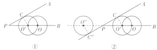 (2)如图②,当点O由$O'$向左继续移动时,PA与圆相交,当移动到$O''$时相切,此时$O''P = PO' = 2cm$,$OO'' = OP + O''P = 5cm$,$\therefore$点O移动的距离d的取值范围是$1cm < d < 5cm$.