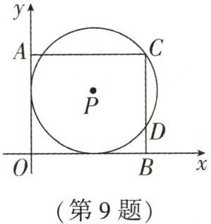 9. (南京中考)如图,在平面直角坐标系中,点P在第一象限,$\odot P$与x轴、y轴都相切,且经过矩形AOBC的顶点C,与BC相交于点D.若$\odot P$的半径为5,点A的坐标是$(0,8)$,则点D的坐标是 (