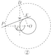 方法二:如图②,连接$OP$,交$\odot O$于点$C$;以点$O$为圆心,$OP$长为半径作圆;过点$C$作直线$CD⊥OP$,交大圆于点$D$;连接$OD$,交小圆于点$E$;连接$PE$,直线$PE$即为所求.