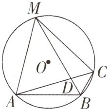 2. (包头中考)如图,在$\odot O$中,B是$\odot O$上的一点,$\angle ABC = 120^{\circ}$,弦$AC = 2\sqrt{3}$,弦BM平分$\angle ABC$交AC于点D,连接MA,MC.