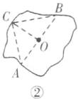 (3) 当线圈做成任意形状的图形时,能被半径为 $ a $ 的圆形纸片完全盖住。理由如下:如图②,取曲线上两点 $ A $,$ B $,使曲线分成相等的两部分,连接 $ AB $,在其中一部分上任取一点 $ C $,连接 $ AC $,$ BC $,$ CO $($ O $ 为 $ AB $ 的中点),则有 $ OC < \frac { 1 } { 2 } ( A C + B C ) < a $,
