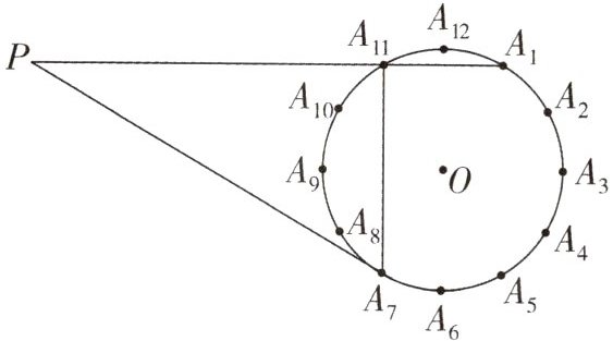 (3)如图所示,连接$A_{11}O$,$∠A_{11}A_{1}A_{7}=\frac {1}{2}∠A_{11}OA_{7}=\frac {1}{2}×\frac {4}{12}×360^{\circ }=60^{\circ }$。$\because PA_{7}$是$\odot O$的切线,$\therefore ∠PA_{7}A_{1}=90^{\circ }$,$\therefore ∠A_{1}PA_{7}=30^{\circ }$,$\therefore PA_{1}=2A_{1}A_{7}=24$,$\therefore PA_{7}=\sqrt {PA_{1}^{2}-A_{1}A_{7}^{2}}=12\sqrt {3}$。