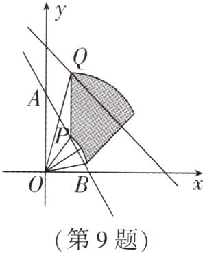 9. (自贡中考)如图,直线$y= -2x+2$与坐标轴交于A,B两点,点P是线段AB上的一个动点,过点P作y轴的平行线交直线$y= -x+3$于点Q,$△OPQ$绕点O顺时针旋转$45^{\circ}$,边PQ扫过区域(阴影部分)面积的最大值是______.