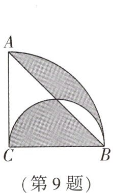 9. (十堰中考)如图,圆心角为$90^{\circ }$的扇形 ACB 内,以 BC 为直径作半圆,连接 AB.若阴影部分的面积为$(\pi - 1)$,则$AC= $