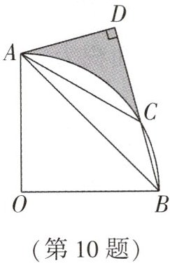 10. (贵港中考)如图,在扇形 OAB 中,点 C 在$\overset{\frown}{AB}$上,$∠AOB= 90^{\circ },∠ABC= 30^{\circ },AD⊥BC$于点 D,连接 AC,若$OA= 2$,则图中阴影部分的面积为______.