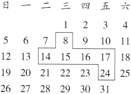11.如图是某月的日历表,在此日历表上可以按图示形状圈出位置相邻的6个数(如:8,14,15,16,17,24).如果圈出的6个数中,最大数与最小数的积为225,则这6个数的和为
