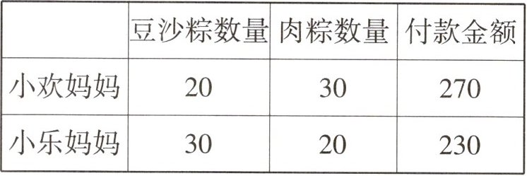 (2)超市为了促销,购买粽子达20个及以上时实行优惠,下表列出了小欢妈妈、小乐妈妈的购买数量(单位:个)和付款金额(单位:元).