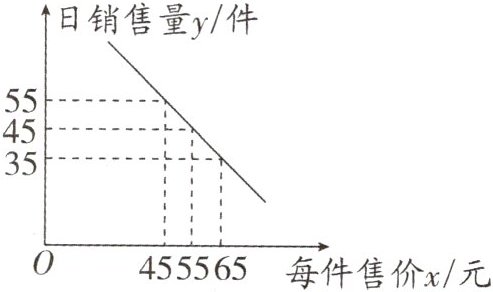 设y与x之间的函数解析式为$y = kx + b(k ≠ 0)$,将$(45,55)$,$(55,45)$代入$y = kx + b$得$\begin{cases}45k + b = 55\\55k + b = 45\end{cases}$,解得$\begin{cases}k = -1\\b = 100\end{cases}$,∴y与x之间的函数解析式为$y = -x + 100$。