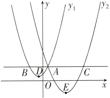 11. (宜宾中考改编)如图,抛物线$y_1 = \frac{1}{2}(x + 1)^2 + 1与y_2 = a(x - 4)^2 - 3交于点A(1,3)$,过点$A作x$轴的平行线,分别交两条抛物线于$B$,$C$两点,且$D$,$E$分别为顶点。则下列结论:①$a = \frac{2}{3}$;②$AC = AE$;③$\triangle ABD$是等腰直角三角形;④当$x > 1$时,$y_1 > y_2$。其中正确的结论有