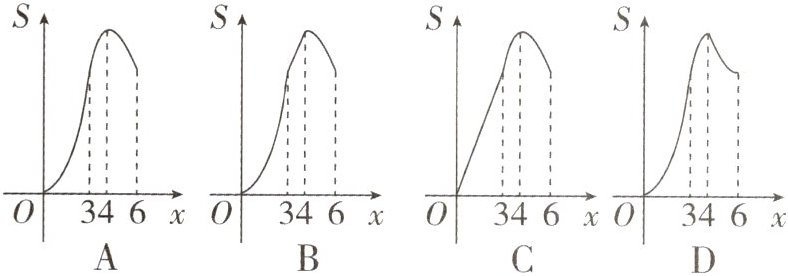 4. (2023·辽宁中考)如图, $ \angle M A N= 60^{\circ} $,在射线 $ A M, A N $ 上分别截取 $ A C= A B= 6 $,连接 $ B C $, $ \angle M A N $ 的平分线交 $ B C $ 于点 $ D $,点 $ E $ 为线段 $ A B $ 上的动点,作 $ E F \perp A M $ 交 $ A M $ 于点 $ F $,作 $ E G / / A M $ 交射线 $ A D $ 于点 $ G $,过点 $ G $ 作 $ G H \perp A M $ 于点 $ H $,点 $ E $ 沿 $ A B $ 方向运动,当点 $ E $ 与点 $ B $ 重合时停止运动.设点 $ E $ 运动的路程为 $ x $,四边形 $ E F H G $ 与 $ \triangle A B C $ 重叠部分的面积为 $ S $,则能大致反映 $ S $ 与 $ x $ 之间函数关系的图象是 ( )