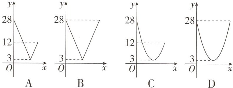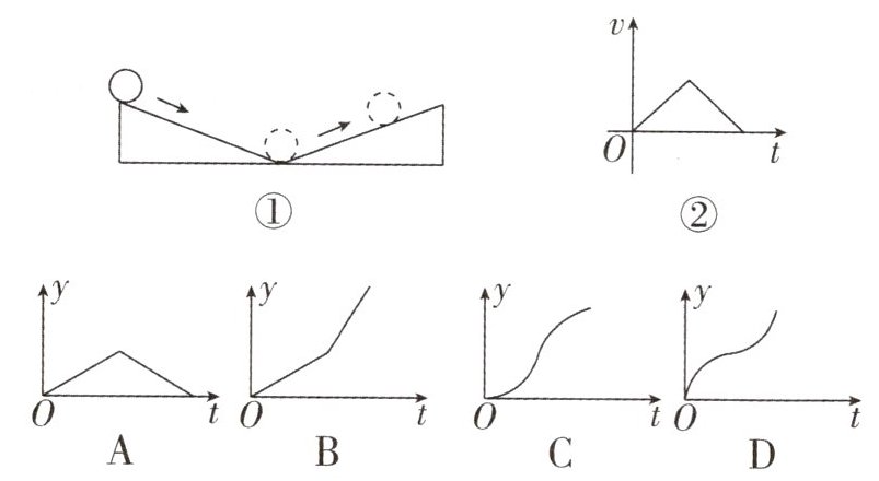 1. (台州中考)如图①,小球从左侧的斜坡滚下,到达底端后又沿着右侧斜坡向上滚,在这个过程中,小球的运动速度 $ v $ (单位: $ \mathrm{m} / \mathrm{s} $)与运动时间 $ t $ (单位: $ \mathrm{s} $)的函数图象如图②,则该小球的运动路程 $ y $ (单位: $ \mathrm{m} $)与运动时间 $ t $ (单位: $ \mathrm{s} $)之间的函数图象大致是 (