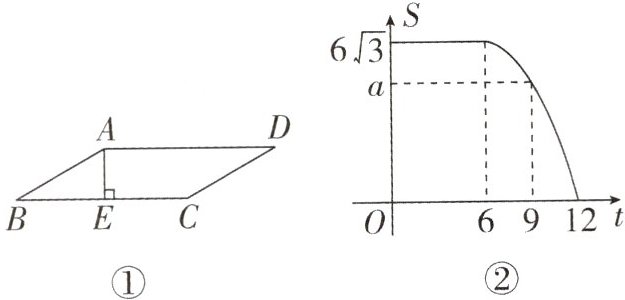 5. (2024·信阳模拟)如图①,已知 $ □ A B C D $ 的边长 $ A B= 4 \sqrt{3}, \angle B= 30^{\circ}, A E \perp B C $ 于点 $ E $.现将 $ \triangle A B E $ 沿 $ B C $ 方向以每秒 1 个单位的速度匀速运动,运动的 $ \triangle A B E $ 与 $ □ A B C D $ 重叠部分的面积 $ S $ 与运动时间 $ t $ 的函数图象如图②,则当 $ t $ 为 9 时, $ S $ 的值是 (