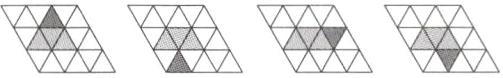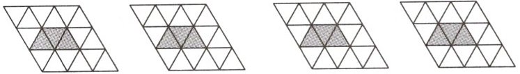 5. (广安中考)数学活动课上,张老师组织同学们设计多姿多彩的几何图形,如图都是由边长为1的小等边三角形构成的网格,每个网格图中有3个小等边三角形已涂上阴影,请同学们在余下的空白小等边三角形中选取一个涂上阴影,使得4个阴影小等边三角形组成一个轴对称图形或中心对称图形,请画出4种不同的设计图形.(规定:凡通过旋转能重合的图形视为同一种图形)