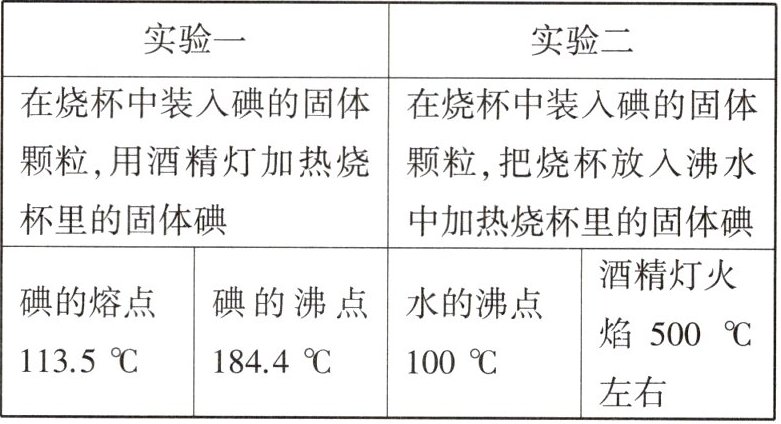 (2)乙实验方案更好,因为酒精灯火焰的温度高于碘的熔点和碘的沸点,可能使碘发生熔化和沸腾,不能说明“碘的升华”;水的沸点低于碘的熔点和碘的沸点,不可能使碘发生熔化和沸腾,能说明“碘的升华”。