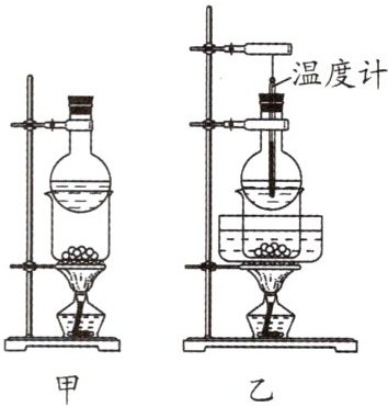 5. 下列两个实验都是为了演示“碘的升华”而设计的。如图甲是小红的操作:在烧杯中放少量的碘,烧杯口放一只装有冷水的烧瓶,用酒精灯给烧杯加热。图乙是小明的操作:在烧杯中放少量的碘,烧杯口放一只装有冷水的烧瓶,插入温度计,用沸水给烧杯加热。