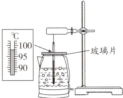 7. (2024·无锡中考)做“观察水的沸腾”实验时,电热水壶中装有适量的水,闭合开关加热。当水沸腾时,温度计的示数如图所示为______ $ ^{\circ}C $。玻璃片下表面出现小水珠,这是______(填物态变化名称)现象。停止加热,水不能继续沸腾,这说明沸腾时需要______。