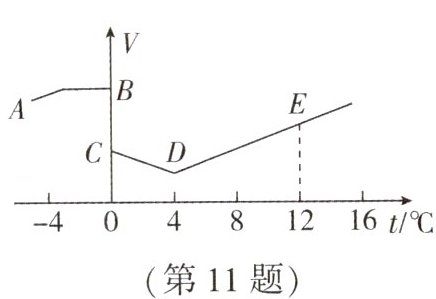 11. 如图所示是一定质量的某种晶体体积随温度变化的图像,分析图像可知,$ AB $ 段处于______(填“固体”“液体”或“固液共存”)状态,$ BC $ 段(不含 $ B $ 点和 $ C $ 点)处于______(填“固体”“液体”或“固液共存”)状态,这种晶体的熔点是______ $ ^{\circ}C $。