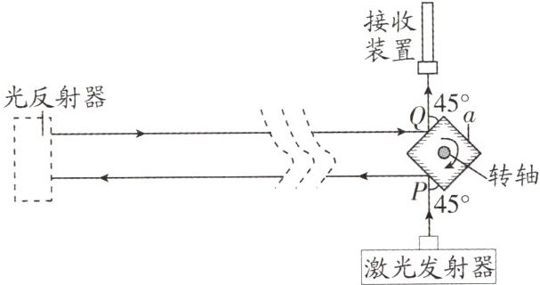 17. 新素材 创新装置 光速的测定在物理学中有多种方法,迈克尔逊曾用类似于下述方法在地球上较精确地测定了光速。将激光发射器和接收装置按图示位置固定,装置a是四个侧面均镀有高反光涂层的正方体,可绕固定的中心轴转动(图示为俯视图),当正方体转动到图示位置静止时,激光束恰能以45°角照射到某侧面中心P点处,反射到相距几十公里外的一个山顶上,经此处的光反射器(内部结构未画出,不计光在其中的传播时间)反射后,平行于原光线射到正方体另一侧面中心Q点处,最终被接收装置接收到。