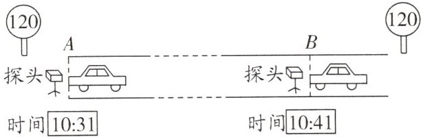 (2) 由图可知,从 $ A $ 运动到 $ B $ 的时间为 $ t = 10 \, \text{min} = \frac{1}{6} \, \text{h} $,$ v = \frac{s}{t} = \frac{25 \, \text{km}}{\frac{1}{6} \, \text{h}} = 150 \, \text{km/h} $,因为 $ 150 \, \text{km/h} > 120 \, \text{km/h} $,所以这辆轿车会被判超速。