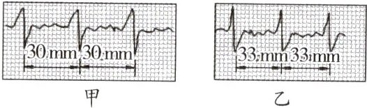 $ 1 $ $ 30 $ $ 1.1 $ 解析:由题意知,甲的心跳次数为 $ \frac{60 \, \text{次}}{60 \, \text{s}} = 1 \, \text{次/s} $,即每秒的心跳次数为 $ 1 $ 次.由图甲知,甲两次心跳之间坐标纸移动的距离 $ s = 30 \, \text{mm} $,坐标纸走纸速度 $ v = \frac{s}{t} = \frac{30 \, \text{mm}}{1 \, \text{s}} = 30 \, \text{mm/s} $.由图乙知,乙两次心跳之间坐标纸移动的距离为 $ 33 \, \text{mm} $,则其两次心跳之间的时间 $ t_1 = \frac{s_1}{v} = \frac{33 \, \text{mm}}{30 \, \text{mm/s}} = 1.1 \, \text{s} $.